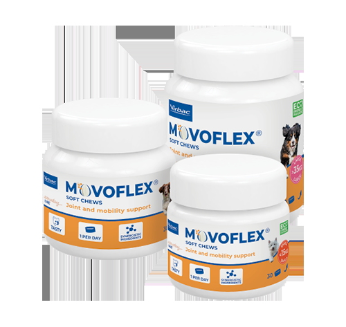Movoflex est un complexe innovant de nouvelle génération chondroprotecteur aidant à maintenir la santé articulaire et la mobilité de votre chien. la synergie de ses composants peut amener une efficacité clinique à partir de 15 jours de traitement : - anitoxydants puissants issus de microalgue - acide hyaluronique - chondroïtine et précurseurs de glucosamine - acides gras omega3 ayant une bonne biodisponibilité - Boswellia, mélange d'acides triterpinoides actifs contre l'inflamation ce complément est indiqué dans l'arthrose, les dysplasies des hanches et des coudes, les interventions chirurgicales ostéoarticulaires. Les composants sont à 97% d'origines naturelles et le produit est écoresponsable, et fabriqué en France. Il se présente sous forme de bouchées appétentes. N'hésitez pas à nous demander conseil !